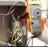 From there we’ll take our meter and switch it over to voltage and check the voltage across both of those terminals to common. We’ll start first with our fan terminal, which is reading 271.0 amps. (You’ll want to write that number down as well).